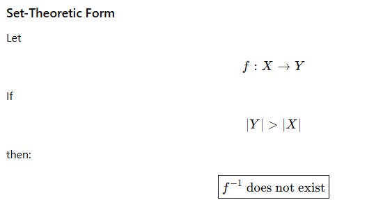 f:X→Y, ∣Y∣>∣X∣⇒f−1 does not exist