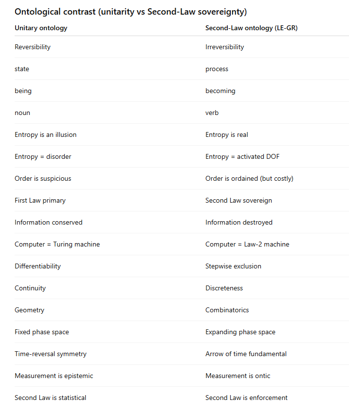 Unitary ontology → Second-Law ontology (LE-GR)